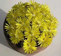 Forma grupos de dos hojas acopladas, divididas por una fisura por donde aparecen las flores. Cada par de hojas forman el cuerpo de la planta que tiene forma cilíndrica o cónica con una superficie plana. De la fisura entre las hojas brota, en periodo vegetativo, las nuevas hojas y en cuanto se abren, las antiguas se agostan. Alcanza los 20 cm de altura y tiene las flores de color amarillo.