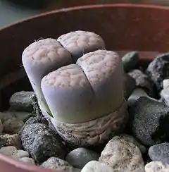 Forma grupos de dos hojas acopladas, divididas por una fisura por donde aparecen las flores. Cada par de hojas forman el cuerpo de la planta que tiene forma cilíndrica o cónica con una superficie plana. De la fisura entre las hojas brota, en periodo vegetativo, las nuevas hojas y en cuanto se abren, las antiguas se agostan.