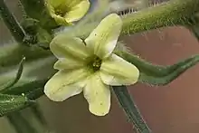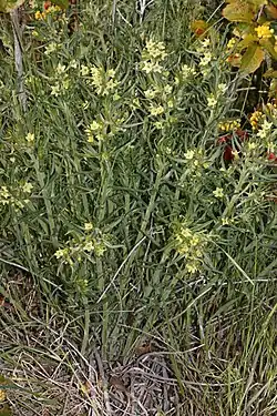 Hierba perenne que crece a partir de una raíz primaria y un cáudice leñoso, está cubierta de pelos finos, más o menos erguidos, especialmente en los tallos. Produce un grupo de tallos frondosos erectos de 20 a 50 centímetros de alto. Los tallos soportan hojas en forma de lanza de hasta 8 centímetros de largo. Racimos de flores con brácteas en forma de hoja aparecen hacia la parte superior del tallo entre las hojas. La corola es de color amarillo claro, a menudo ligeramente verdoso, y de aproximadamente un centímetro de largo y ancho. El estilo es corto. La fruta consiste en uno o dos, a veces cuatro, nueces grises brillantes agrupadas, 3.5 a 6, a veces hasta 8 mm de largo. Esta planta fue utilizada como anticonceptivo por varios grupos de nativos americanos, incluidos los navajos y los shoshone.[1] Los estudios en ratones mostraron que la planta redujo su fertilidad.[2]