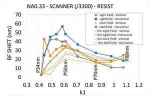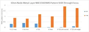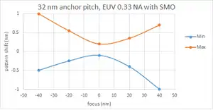 La iluminación fuera del eje de la retícula es también la causa de la no telecentricidad en el desenfoque de obleas, que consume la mayor parte del presupuesto de superposición de 1,4 nm del escáner NXE: 3400 UVE[65] incluso para reglas de diseño tan sueltas como 100 nm.[66] El peor error de colocación de patrón incorregible para una línea de 24 nm fue de aproximadamente 1,1 nm, en relación con una línea eléctrica adyacente de 72 nm, por cada 80 nm de desplazamiento de la posición de enfoque de la oblea en una sola posición de hendidura; cuando se incluye el rendimiento a través de la rendija, el peor error es más de 1,5 nm en la ventana de desenfoque de la oblea.[62] En 2017, un microscopio actínico que simulaba un sistema de litografía NA UVE de 0,33 con iluminación de cuásar 45 de 0,2/0,9 mostró que una matriz de contacto de tono de 80 nm cambió de -0,6 a 1,0 nm mientras que una matriz de contacto de tono de 56 nm cambió de -1,7 a 1,0 nm con relación a un línea de referencia horizontal, dentro de una ventana de desenfoque de +/-50 nm.[67]