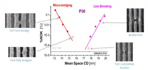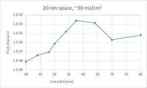 La litografía UVE es particularmente sensible a los efectos estocásticos.[40] En una gran cantidad de características impresas por UVE, aunque la gran mayoría está resuelta, algunas sufren una falla completa de impresión, por ejemplo. Faltan agujeros o líneas de puente. Una contribución significativa conocida a este efecto es la dosis utilizada para imprimir. Esto está relacionado con el problema del ruido de disparo, que se tratará más adelante. La probabilidad de falla estocástica aumenta exponencialmente a medida que disminuye el tamaño de la característica, y para el mismo tamaño de característica, aumentar la distancia entre las características también aumenta significativamente la probabilidad.[41] Los cortes de línea que están relativamente espaciados son un problema importante. El rendimiento requiere la detección de fallas estocásticas por debajo de 1e-12.[41]