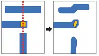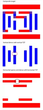 El espacio impreso entre la punta de una línea y la línea perpendicular a la que se enfrenta es de 25-35 nm para líneas de medio paso de 22 nm (con un espacio vacío nominal de 20 nm).[81] Para un patrón de espacio de línea de 22 nm con un hueco nominal de 22 nm, la iluminación convencional produce una distancia de punta a línea de 38 nm, mientras que la iluminación de cuásar produce una distancia de 28 nm.[82] La brecha de punta a lado es una de las características más difíciles de imprimir en un patrón bidireccional.[81]