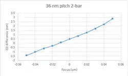 Una extensión de la caja de dos barras a una rejilla que consta de muchas líneas horizontales muestra una sensibilidad similar al desenfoque.[58] Se manifiesta en la diferencia de CD entre las líneas de borde superior e inferior del conjunto de 11 líneas horizontales. La siguiente tabla enumera la diferencia de CD en el rango de enfoque de 100 nm bajo la iluminación del cuásar (la iluminación del cuásar se describirá en la sección sobre iluminación óptima en función del tono).