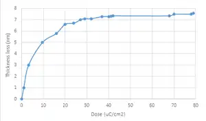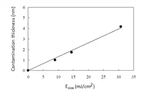 La luz UVE genera fotoelectrones al ser absorbidos por la materia. Estos fotoelectrones a su vez generan electrones secundarios, que disminuyen la velocidad antes de involucrarse en reacciones químicas.[47] Cabe señalar que, a dosis suficientes, se sabe que los electrones de 40 eV penetran en el espesor de 180 nm, lo que lleva al desarrollo.[48] Más detalles sobre los electrones secundarios en la exposición fotoprotectora UVE se proporcionan a continuación. A una dosis de 160 μC/cm2, correspondiente a 15 mJ/cm2 UVE dosis, suponiendo que un electrón/fotón, 30 eV electrones extraídos 7 nm de PMMA resisten después del desarrollo estándar.[49] Para una dosis más alta de 30 eV de 380 μC/cm2, equivalente a 36 mJ/cm2 a un electrón/fotón, se eliminan 10,4 nm de PMMA resist.[50] Estos indican las distancias que los electrones pueden viajar en resistencia, independientemente de la dirección.[51]