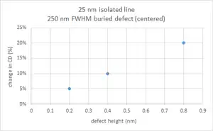 Fundamentalmente, el comportamiento de los rayos de luz dentro del plano de reflexión (que afecta a las líneas horizontales) es diferente del comportamiento de los rayos de luz fuera del plano de reflexión (que afecta a las líneas verticales).[55] De manera más visible, las líneas horizontales y verticales de tamaño idéntico en la máscara UVE se imprimen en diferentes tamaños en la oblea.