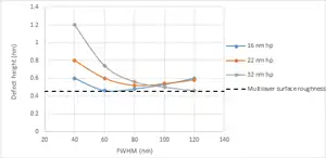 El uso de la reflexión hace que la posición de exposición de la oblea sea extremadamente sensible a la planicie del retículo y la abrazadera del retículo. Por lo tanto, es necesario mantener la limpieza de la pinza de retícula. Pequeñas desviaciones (escala mrad) en la planitud de la máscara en la pendiente local, junto con el desenfoque de la oblea.[59] Más significativamente, se ha encontrado que el desenfoque de la máscara produce grandes errores de superposición.[60][61] En particular, para una capa de 1 nodo de metal de 10 nm (incluidas 48 nm, 64 nm, 70 nm tonos, líneas aisladas y eléctricas), el error de colocación del patrón no corregible fue de 1 nm para el cambio de posición z de la máscara de 40 nm.[62] Este es un cambio de patrón global de la capa con respecto a las capas previamente definidas. Sin embargo, las características en diferentes ubicaciones también cambiarán de manera diferente debido a diferentes desviaciones locales de la planitud de la máscara, por ejemplo, de defectos enterrados bajo la multicapa. Se puede estimar que la contribución de la falta de planeidad de la máscara al error de superposición es aproximadamente 1/40 veces la variación del espesor de pico a valle.[63] Con la especificación de 50 nm de pico a valle en blanco, es posible un error de colocación de imagen de ~1,25 nm. Las variaciones de grosor en blanco de hasta 80 nm también contribuyen, lo que lleva a un cambio de imagen de hasta 2 nm.[64]