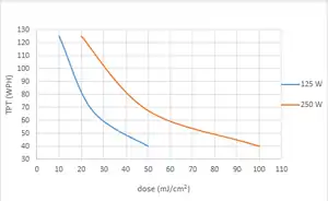 El rendimiento está vinculado a la fuente de alimentación, dividido por la dosis.[29] Una dosis más alta requiere un movimiento de etapa más lento (menor rendimiento) si no se puede aumentar la potencia del pulso.