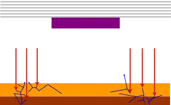 La incidencia oblicua en un sistema óptico reflectante conduce a efectos de sombra en presencia de un absorbente de máscara. Por ejemplo, un lado (detrás de la sombra) aparecerá más brillante que el otro (dentro de la sombra).[54]