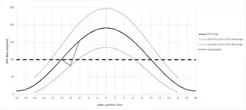 El desenfoque de la oblea también conduce a errores de colocación de la imagen debido a desviaciones de la planitud de la máscara local. Si la pendiente local se indica con un ángulo α, se proyecta que la imagen se desplace en una herramienta de proyección 4x en 8 α x (PDE/2)=4 α PDE, donde PDE es la profundidad de enfoque.[68] Para una profundidad de enfoque de 100 nm, una pequeña desviación local de la planitud de 2,5 mrad (0,14°) puede llevar a un cambio de patrón de 1 nm.