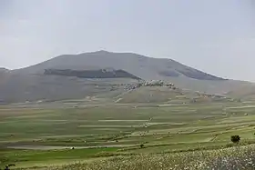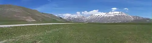 ![]() Vista de la meseta de Castelluccio: en el fondo a la izquierda se puede ver la localidad en lo alto de una colina; a la derecha, el monte Vettore | ||