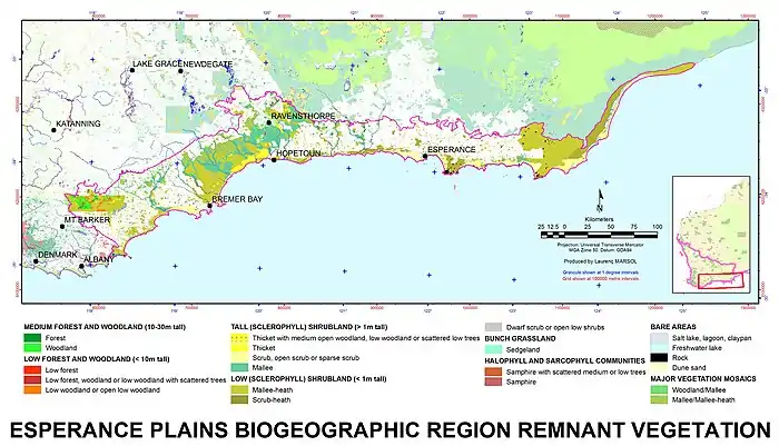 La principal formación vegetal de la región de las llanuras de Esperance es brezales de mallee; esta cubre alrededor del 58% de la región. Otras formas de vegetación significativas incluyen mallee (17%), matorral (13%) y matorral costero (4%). Hay muy pocos bosques; las únicas comunidades boscosas son algunas de Eucalyptus marginata (jarrah), Corymbia calophylla (marri) y E. wandoo (wandoo) en valles de la cordillera Stirling (1%); y algo de Eucalyptus loxophleba (goma de York) y Eucalyptus occidentalis (yate de copa plana) en zonas bajas. También hay una pequeña cantidad de bosque bajo en islas frente a la costa. El 1,7% de la región no tiene vegetación.