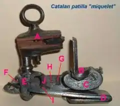 Aparte, la llave de agujeta, contemporánea de la llave de patilla se fabricó bastante en Ripoll, sobre todo en la pistola de cañón largo llamada Pedreñal. Ripoll fue un importante centro armero español. Curiosamente, una copia de la llave de agujeta, a veces conocida como el llamado "pie árabe-bloqueo", sobrevivió en el norte de África con pequeñas modificaciones, como Miquelete de la Cabilia, hasta bien entrado el siglo XX.[18][19]