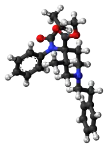 O=(CC)N(c1ccccc1)[C@@]2(C(OC)=O)CCN(C[C@H]2C)CCc3ccccc3