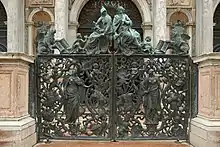Antonio Gai realizó la elaborada puerta de bronce (1733-1734) con las figuras alegóricas de la Vigilancia (a la izquierda con la lámpara encendida y la grulla sosteniendo un guijarro con el pie) y la Libertad (a la derecha con el píleo sobre un bastón). La puerta está coronada por la Paz Armada (a la izquierda con un casco y una rama de olivo) y la Felicidad Pública (a la derecha con el caduceo y una cornucopia).