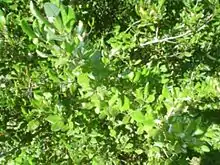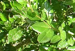 Es un árbol perennifolio de hasta 10 m de altura, con hojas pecioladas, opuestas y alternas, de color verde lustroso por el haz y verde blancuzco por el envés en el que es notorio el nervio medio.