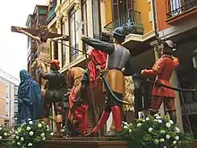 Copia del conjunto vallisoletano tallado por Gregorio Fernández entre 1610 y 1617[2][4][5] y actualmente desaparecido a excepción de tres imágenes (Longinos, la Virgen y San Juan), conservadas todas ellas en el Museo Nacional de Escultura,[6] el conjunto de Palencia se compone de un total de siete imágenes, lo que lo convierte en uno de los grupos escultóricos más numerosos en desfilar en Semana Santa:[7] Cristo, la Virgen, San Juan, Longinos y tres sayones. Las imágenes de la Virgen y San Juan se disponen simétricamente a ambos lados de la cruz, aumentando el grado de simetría con los dos sayones que cierran la escena,[7] los cuales dotan de cierto carácter majestuoso y teatral a la obra. Relacionado con La Crucifixión,[2] paso de idéntica temática en Medina de Rioseco, a diferencia de este el conjunto de Palencia carece de una representación de María Magdalena, recayendo la carga emocional de la pieza únicamente en San Juan y la Virgen: