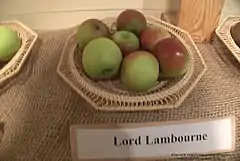 'Lord Lambourne' es una variedad de manzana, perteneciente a una serie de manzanas desarrolladas por "Laxton Brothers Nursery" en Bedforsdshire (Reino Unido) hasta principios de 1900. Está nombrada en honor del presidente de la Royal Horticultural Society en 1923, es el resultado de un cruce entre James Grieve x Worcester Pearmain. Introducido en 1923.[5][6]
