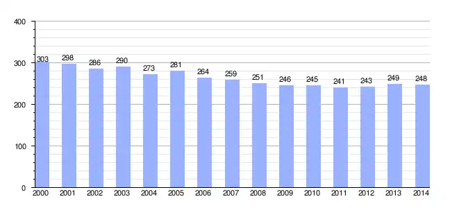 Gráfica de evolución demográfica de Loriana entre 2000 y 2014 |