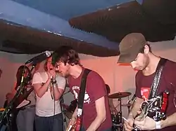 ![]() (d-i) Ellen, Gareth, Neil y Tom en una actuación. | ||