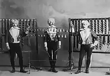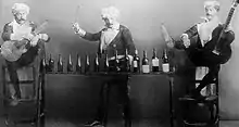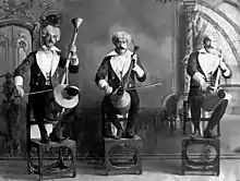 Los tres bemoles. Consiste la originalidad de estos artistas en producir bellas piezas musicales valiéndose de objetos que, por los usos a los que se destinan, están muy lejos de remplazar a los instrumentos de viento y cuerda. Actualmente trabajan en el Teatro Caracas donde son muy aplaudidos”. A pesar de la nota destacar la invención de algunos instrumentos, también se pueden observar en la foto la presencia de instrumentos conocidos como la guitarra, el violín, el xilófono, las campanas.[24](Texto acompañando una fotografía del grupo).