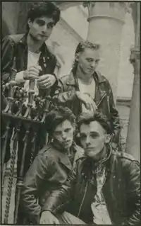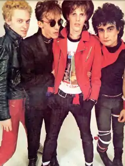 ![]() Los Violadores posando para la revista Pelo, junio de 1986. De izquierda a derecha: Robert Zelazek, Stuka, Pil Trafa y Sergio Gramática. | ||