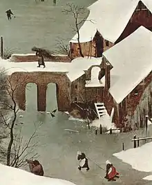 Sobre este frío paisaje las figuras humanas, los animales y los árboles parecen sombras chinescas. El tema principal es el paisaje, un paisaje invernal en el que se representa la nieve, el hielo, anticipando los grandes logros en este género de la pintura barroca.[1]