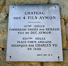 El castillo de Cubzac-les-Ponts, es la ruina de una fortaleza erigida en 1249 por Simón V de Montfort en nombre de su rey, está ligado a la leyenda de Los cuatro hijos de Aymón. Alphonse Huillard-Breholles estableció una conexión entre este sitio y un castillo llamado Montauban, que se dice que estuvo allí.[215] Según la Gran Crónica atribuida a Mateo de París,[lower-alpha 8] que el historiador moderno había traducido y publicado, el rey Juan I de Inglaterra capturó este castillo de Montauban en 1206.[216] La hipótesis de que sería el Montauban de la leyenda ha sido retomada a lo largo de los siglos, ayudando a dar a la meseta de Cubzac el apodo de «meseta de los cuatro hijos de Aymon».[217] Sin embargo, un análisis de las fechas y los hechos muestra una inconsistencia,[218] la existencia pasada del castillo de los cuatro hijos de Aymón en Cubzac es más probable que se deba a la leyenda.[219]