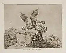 - 179 x 220 mm. Aguafuerte. Un enjambre de extraños murciélagos o vampiros se abaten sobre una figura yacente, acaso muerta, bella y noble en sus harapos, que, como consecuencia de la estampa anterior, se ve picoteada y destrozada por esos avechuchos, el mayor de los cuales, posado sobre el personaje tendido (España acaso) le sorbe la sustancia de su pecho. Esta terrible imagen, de espantosa belleza, parece referirse a los hombres de presa que van a aprovecharse de la restauración femandina para devorar el cadáver de España. La técnica es de una elegancia que puede recordar a los Caprichos y que aumenta lo espantoso de la imagen, de tan rara perfección.
