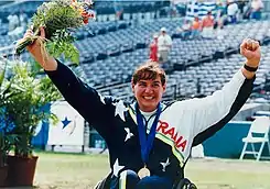 - Sauvage saludando a la multitud con el puño en alto mientras está en el podio de medallas en los Juegos Paralímpicos de Verano 2000
