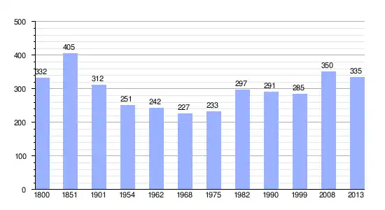 Los datos demográficos contemplados en este gráfico de la comuna de Lué-en-Baugeois[4] se han cogido de 1800 a 1999 de la página francesa EHESS/Cassini, y los demás datos de la página del INSEE.[5]