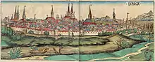 Plano de la ciudad de Lübeck con su nombre en neolatín "Lubeca" en la parte diestra superior de la imagen.