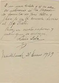 Luis Solá, Tarragona, Cárcel Pilatos, en la noche del 19 al 20 de octubre de 1939».