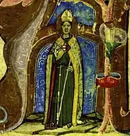 San Luis de Tolosa con el escudo de armas de la familia real Anjou de Hungría. Imagen de la crónica ilustrada húngara.
