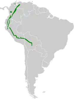 Se le puede encontrar en Bolivia, Colombia, Ecuador, Perú y Venezuela, en bosques húmedos tropicales y subtropicales, así como en bosques de montaña en altitudes entre los 1650 y los 3000 m.[4]