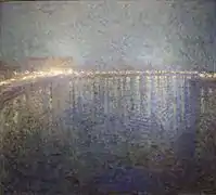 Por último, la noche ha sido siempre una singularidad dentro de la pintura, hasta el punto de constituir un género propio: el nocturno. En estas escenas la luz procede de la luna, las estrellas o de algún tipo de iluminación artificial (fogatas, antorchas, velas o, más recientemente, luz de gas o eléctrica). La justificación para una escena nocturna se ha dado generalmente a partir de temas iconográficos ocurridos en esta franja horaria. En el siglo XIV la pintura empezó a alejarse del contenido simbólico y conceptual del arte medieval en busca de un contenido figurativo basado en un eje espacio-temporal más objetivo. Los artistas renacentistas eran refractarios a la ambientación nocturna, por cuanto su experimentación en el terreno de la perspectiva lineal requería de un marco objetivo y estable en el que la plena luz era indispensable. Así, Lorenzo Ghiberti afirmó que «no es posible que se vea en las tinieblas» y Leonardo escribió que «tinieblas significa completa privación de luz». Leonardo aconsejaba una escena nocturna únicamente con iluminación de un fuego, como un mero artificio para volver diurna una escena nocturna. Sin embargo, el esfumado leonardesco abrió una primera puerta a una representación naturalista de la noche, gracias a la disminución cromática en la distancia en el que el blanco azulado del aire luminoso leonardesco se puede convertir en un negro azulado para la noche: así como el primero crea un efecto de lejanía el segundo provoca cercanía, la dilución del fondo en la penumbra. Esta tendencia tendrá su punto culminante en el tenebrismo barroco, en el que la oscuridad se emplea para añadir dramatismo a la escena y para enfatizar ciertas partes del cuadro, muchas veces con un aspecto simbólico. Por otra parte, en el siglo XVII la representación de la noche adquiere un carácter más científico, especialmente gracias al invento del telescopio por Galileo y a una más detallada observación del cielo nocturno. Por último, los avances en iluminación artificial en el siglo XIX potenciaron la conquista del horario nocturno, que se convierte en un horario de ocio y diversión, circunstancia que fue especialmente plasmada por los impresionistas.[60]
