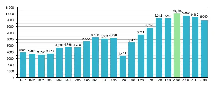 Número de habitantes | 6,319 | 6,063 | 6,238 | 3,411 | 5,517 | 6,714 | 7,776 | 9,312 | 9,249 | 10,045 | 9,687 | 8,940 |