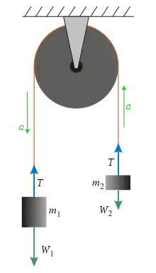 Para diferencias muy pequeñas de masa y entre y , el momento de inercia () sobre la polea de masa no despreciable de radio no puede ser despreciada. La aceleración angular de la polea viene dada por:
