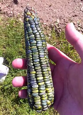 La planta del maíz verde puede alcanzar los 2 m de altura, y producen mazorcas de 17 a 25 cm de largo.[1] Los granos grandes tienen un exterior liso y brillante, con una característica abolladura causada por la deshidratación. El tono varía de amarillo bronce a verde esmeralda oscuro, generando coloridos degradados en la mazorca.