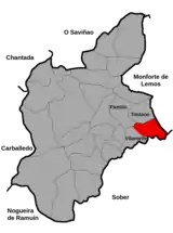 Limita al norte con las parroquias de Toldaos y Vid al norte, las parroquias de Pantón y Vilamelle al oeste, Distriz al este y Refojo y Neiras al sur.
