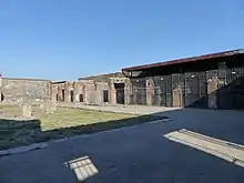 Al exterior del muro norte y en la cara interior del muro sur se disponen unos pequeños habitáculos en hilera, construidos con opus incertum hasta una altura de 1.35 metros, y con caliza y toba volcánica por encima de esa altura. El pavimento está formado por fragmentos de teja troceados, travertino y mármol, recubiertos con mortero.