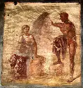Una de las escenas de la zona inferior muestra a Penélope reconociendo a Ulises tras su retorno, mientras que en otra aparece Ío vigilada por Argos y en una tercera, Medea planea la muerte de sus hijos.[4]En la parte superior, sobre un fondo azul, se puede apreciar a una joven con útiles para el sacrificio y un sátiro tocando el aulós. También aparecen representaciones de naturalezas muertas con pájaros, aves domésticas, jarras de vino, fruta, flores, cestos y pescados en un estilo naturalista.[6]Otra escena muestra a varios cupidos que coronan a un asno con guirnaldas, mientras que en un segundo plano aparecen unas ruedas de molino. Este fresco probablemente simbolizaba el festival de Vesta, en el cual los asnos eran relevados de su trabajo.