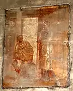 En el muro oeste del patio interior se conservan una serie de frescos pertenecientes al cuarto estilo pompeyano,[16]que se cree que son de un periodo posterior al terremoto del 62. En el centro de cada imagen se representó una escena mitológica, alrededor de la cual se dispuso un fondo negro con un recercado en rojo. Entre cada panel individual se reprodujeron unas vistas arquitectónicas de edificios en verde y rojo pálido sobre un fondo blanco. Los delicados elementos arquitectónicos hacen que los paneles negros emerjan y dividen el muro en una zona inferior y otra superior.[4]