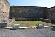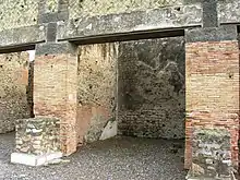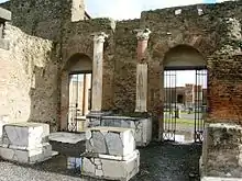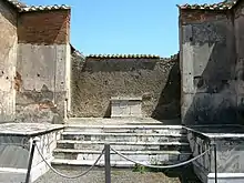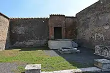 La entrada está dividida en tres espacios por medio de dos columnas.[4]En el interior puede observarse un pequeño altar situado a la derecha de la estancia, al que se accede subiendo tres escalones. Está formado por dos piezas de mármol sobre las cuales se apoya una mesa de basalto. Esta base tiene un borde en relieve y un hueco en una esquina, que sugiere que el altar se empleaba para realizar libaciones.[34]Junto al muro sur también se adosa un podio recubierto de mármol, cuya función permanece desconocida. Se ha sugerido que podría ser utilizado para que se sentaran los praecones (heraldos o pregoneros) y los argentarii (cambistas) durante las subastas, al igual que en los nichos del lado mayor del edificio de la Eumachia.[18]Sin embargo, esta hipótesis iría en contra del supuesto carácter religioso de la estancia. Por su parte, Nissen propuso que el podio podría haber servido para colocar encima las imágenes de los lares.[35]