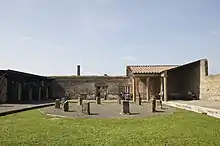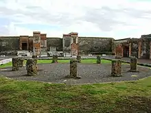 En el centro del macellum se disponen doce pedestales de toba volcánica,[16]formando un espacio circular en forma de dodecaedro monóptero.[20]Inicialmente se creyó que podían ser los restos de un tholos o santuario circular[21](que habitualmente albergan en su interior un pozo y un aljibe), puesto que se encontró un pozo en el centro del espacio, aunque no el aljibe. También se pensó que la rotonda era similar a otros macella, tal vez a modelos más elaborados de la Grecia oriental y de África, u otros ejemplos romanos como el de Puteoli.