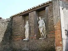 Los nichos de la derecha alojan actualmente los moldes de escayola de las dos estatuas encontradas en el lugar, una masculina y otra femenina.[25]Al principio se creyó erróneamente que eran las imágenes de Marco Claudio Marcelo y Octavia la Menor.[26]Marcelo era el patrón de Pompeya, así que se tomó por válida la suposición. Las figuras de las otras hornacinas se atribuyeron a Agripina y Nerón, aunque actualmente se piensa que eran otros miembros no identificados de la familia imperial.[27]En el recinto se encontró además un brazo con un globo en su mano, que tal vez pertenecía a la estatua de un emperador.[26]
