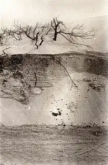A finales de la década de 1940, el horizonte forestal ya estaba muy degradado: árboles escasos, mutilados, enterrados en la arena ( ibidem ). En 1983, científicos belgas, franceses y holandeses alertaron al Valí de Orán sobre la importancia internacional de las marismas de Macta y sobre el interés ecológico del bosque de dunas costeras.[11] Pero, con respecto a este rodal forestal, las imágenes de Google Earth no indican que su degradación se haya detenido.