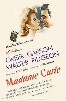 Madame Curie es una película biográfico dramática de 1943 producida por Metro-Goldwyn-Mayer,[2][3] dirigida por Mervyn LeRoy, y que relata la vida de los científicos Marie Curie y Pierre Curie, protagonizados por Greer Garson y Walter Pidgeon, respectivamente. El guion, adaptado de la obra Madame Curie escrita por Ève Curie, hija de los científicos, fue escrito por Paul Osborn, Paul H. Rameau y Aldous Huxley, este último sin acreditar.