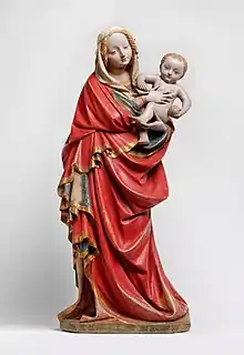 La figura de la Madona se halla distribuida en torno a un eje central situado entre la cabeza y la base, presentando una pose estática. El torso está cubierto con suntuosas telas divididas por una gran cantidad de pliegues en forma de cuenco, de horquilla y de tubo. Respecto a las piernas, estas están notablemente separadas, con todo el peso descansando sobre la derecha. La Virgen sostiene al Niño Jesús sobre la pierna izquierda, desde donde las telas discurren en diagonal para reunirse en el centro en forma de dobleces serpenteantes y terminar en el lado derecho, donde se forman pliegues que caen en cascada. Estos pliegues son constantes en toda la tela, respetando el movimiento y formando suaves transiciones, con la única excepción en la zona del hombro derecho, poco diferenciada respecto a las demás.