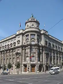 - Una estatua en lo alto del edificio del Gobierno de Serbia, la Madre Serbia sosteniendo un escudo y la Cruz de Serbia.