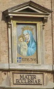 En 1980, durante el Congreso Universitario UNIV -un encuentro de universitarios realizado en Roma durante la Semana Santa que nació bajo la inspiración de San Josemaría Escrivá, fundador del Opus Dei- un joven logró decir al Papa que no había encontrado ninguna imagen de la Virgen en la Plaza de San Pedro. De hecho, aunque haya 162 estatuas de santos en la Plaza, ninguna de ellas retrata a la Virgen María. El Papa le contestó "entonces habrá que completar la Plaza". A pedido del Beato Álvaro del Portillo -sucesor de San Josemaría- el arquitecto español Javier Cotelo buscó una solución arquitectónica para la imagen, y se la sugirió al Papa en dos momentos: en julio de 1980 y enero de 1981. El 7 de diciembre de 1981, se instaló un mosaico dedicado a Maria Mater Ecclesiae -Madre de la Iglesia- en una antigua ventana de edificio localizado entre la Plaza de San Pedro y el Cortile de San Damaso, de manera que se la pueda ver desde toda la Plaza. El mosaico fue hecho en el taller de mosaicos del Vaticano . El día siguiente, 8 de diciembre de 1981 -fiesta de la Inmaculada- el papa Juan Pablo II bendijo el mosaico desde su ventana, como la última piedra de la Plaza de San Pedro.[6]
